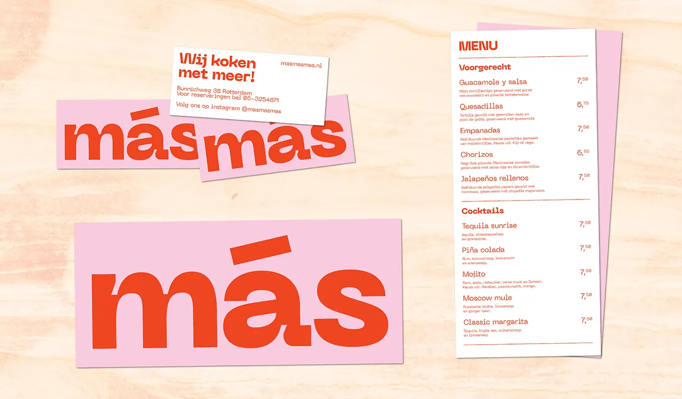 De visuele identiteit kent twee lagen. Enerzijds belichaamt het modulaire, speelse karakter — als confetti gevormd — de Mexicaanse feestelijkheid en het vieren van het leven. Anderzijds verwijst het naar de vrijheid waarmee gasten hun taco’s samenstellen: sauzen, salsa’s, toppings… strooi erop wat je wilt! De combinatie van zachtroze en knallend rood geeft de identiteit een levendig en energiek karakter.