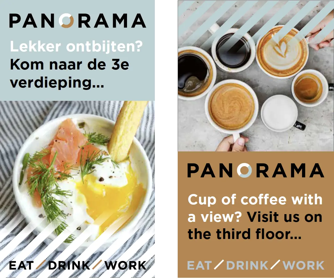 Het interieur ademt rust en comfort, met volop ruimte voor privacy én voor inspirerende ontmoetingen. In samenwerking met Spaces is Panorama ingedeeld in een uitnodigende werkruimte en een levendig horecagedeelte. Hier vind je een gezamenlijke receptie met een gezellige coffeecorner en een vrij toegankelijke restaurantzone met verse, smaakvolle gerechten. De restaurantzone bestaat uit een free flow uitgifte waar de gasten zelf de gerechten kunnen pakken en samenstellen. Bovendien wordt vanuit de centrale keuken de banqueting voor Spaces verzorgd.